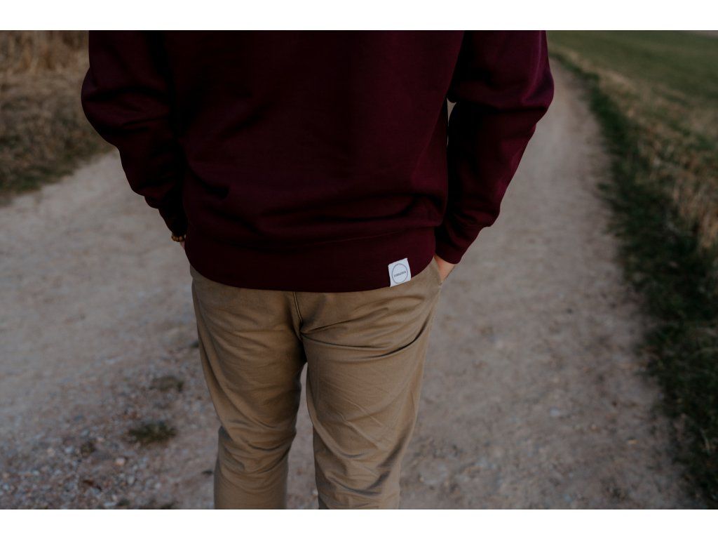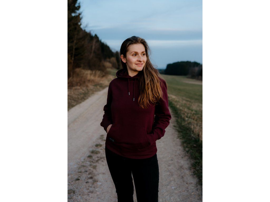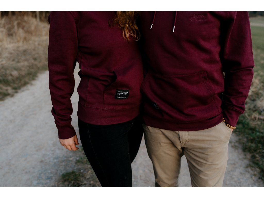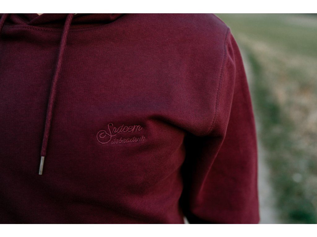 - Mikina má na srdci výšivku v barvě tón v tónu s textem "Srdcem dobradruh", vpravo na přední kapse našitý štítek s mottem značky a na zadním lemu vpravo našitý štítek s logem.