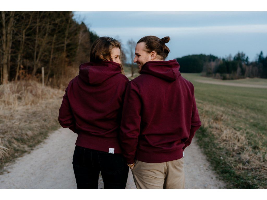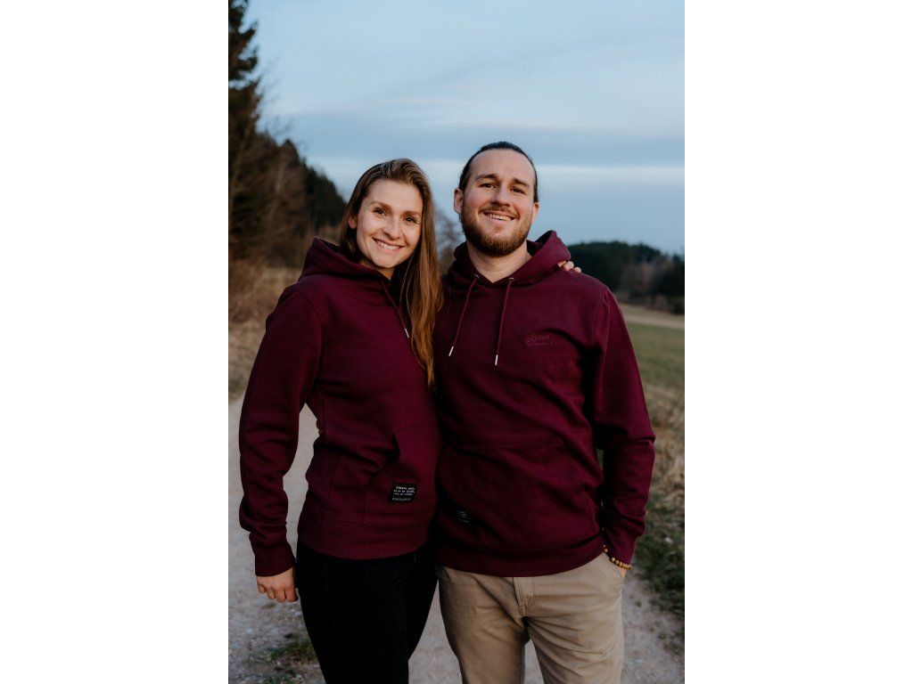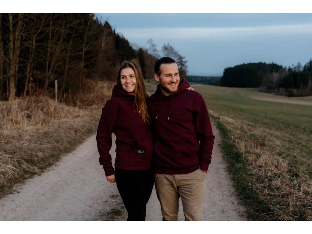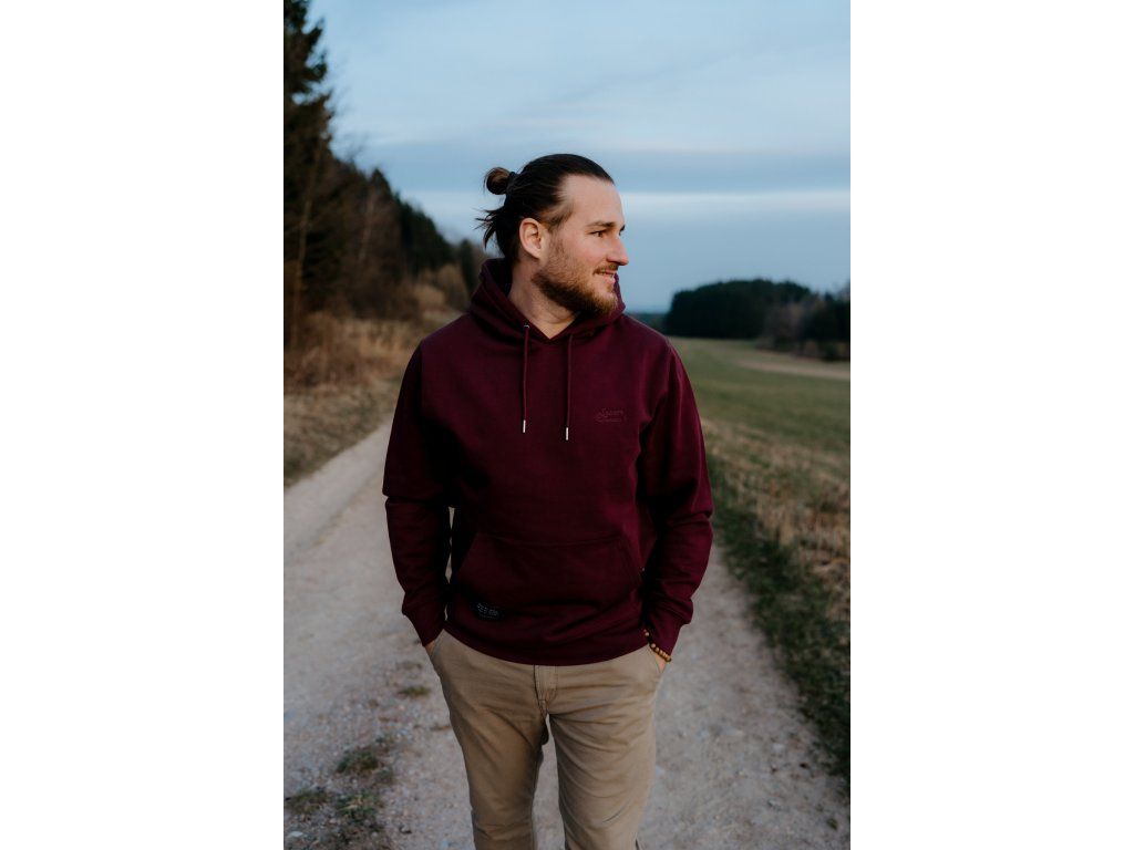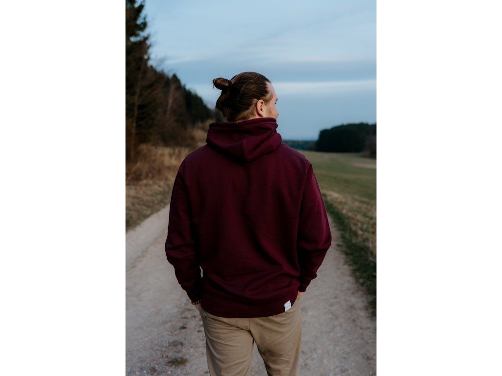 - Mikina má na srdci výšivku v barvě tón v tónu s textem "Srdcem dobradruh", vpravo na přední kapse našitý štítek s mottem značky a na zadním lemu vpravo našitý štítek s logem.