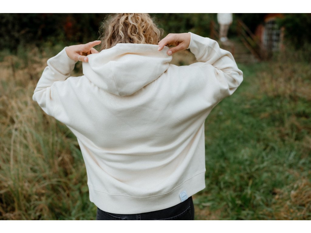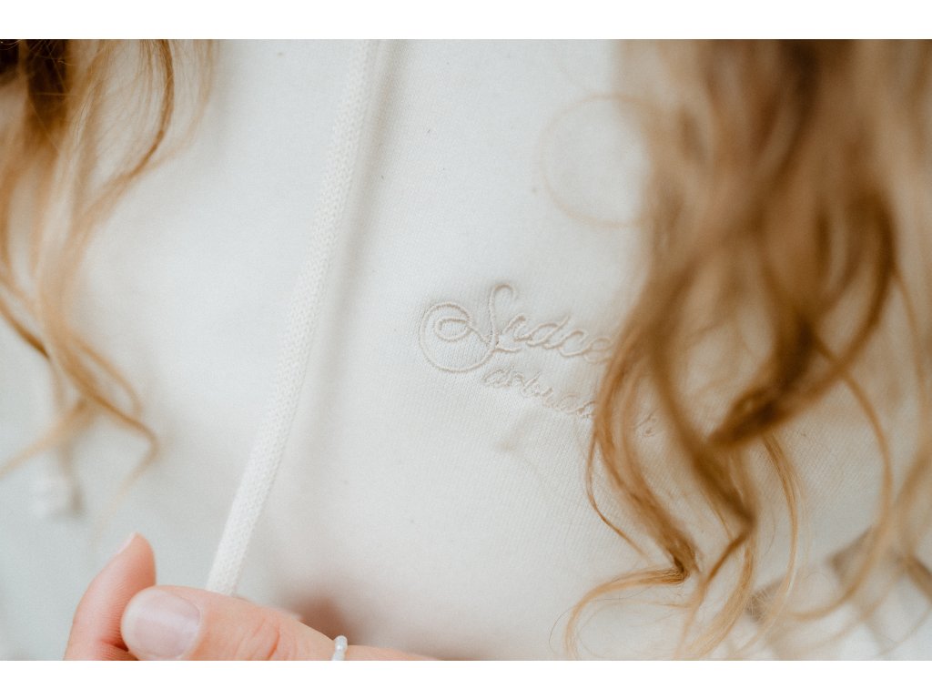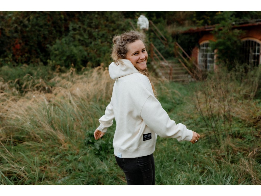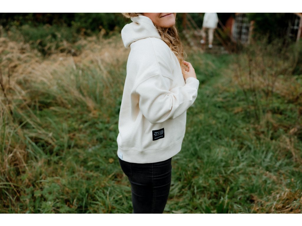 - Mikina má na srdci výšivku Srdcem dobradruh, vpředu nad spodním lemem našité motto značky a na zadním lemu našité logo.