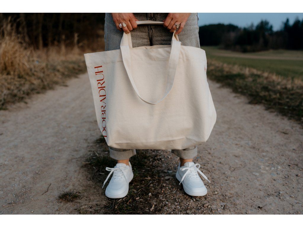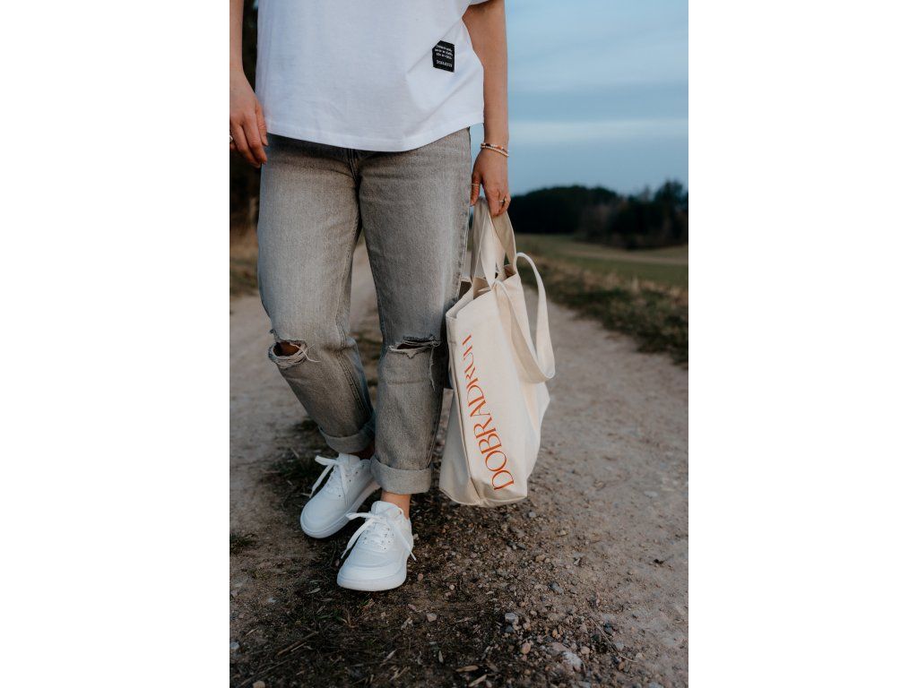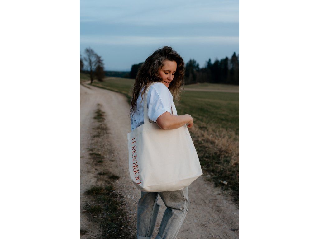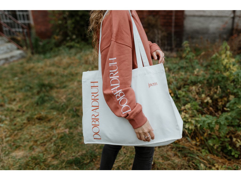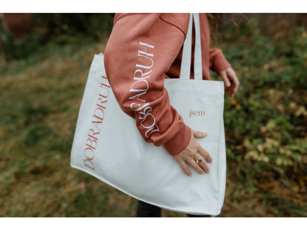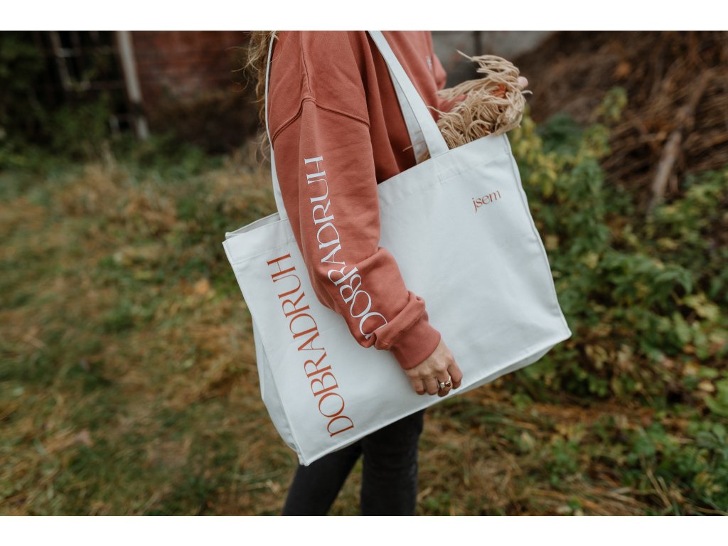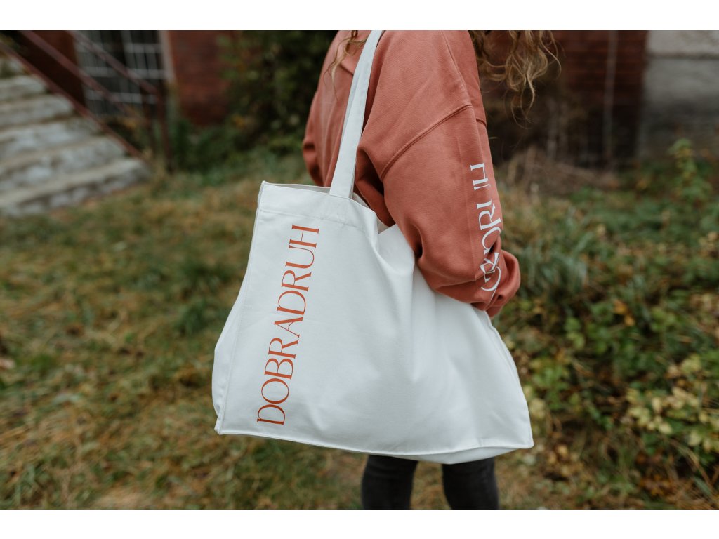- Taška má na jedné straně tisk jsem dobradruh v cihlové barvě a na druhé našitý štítek s mottem značky.