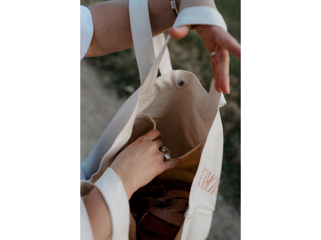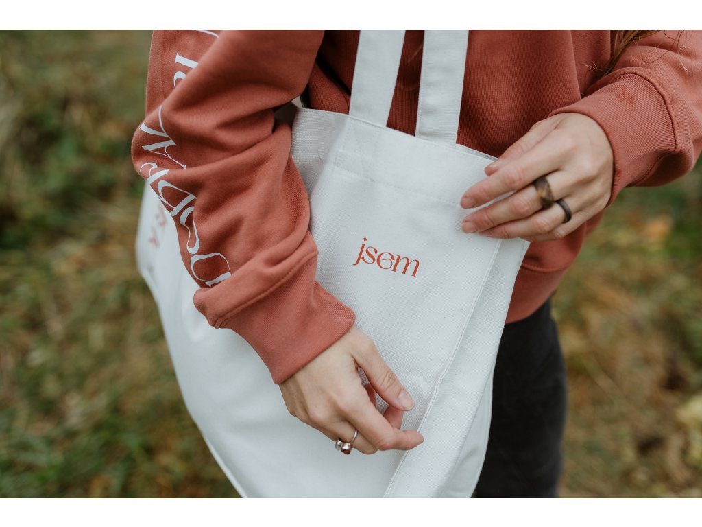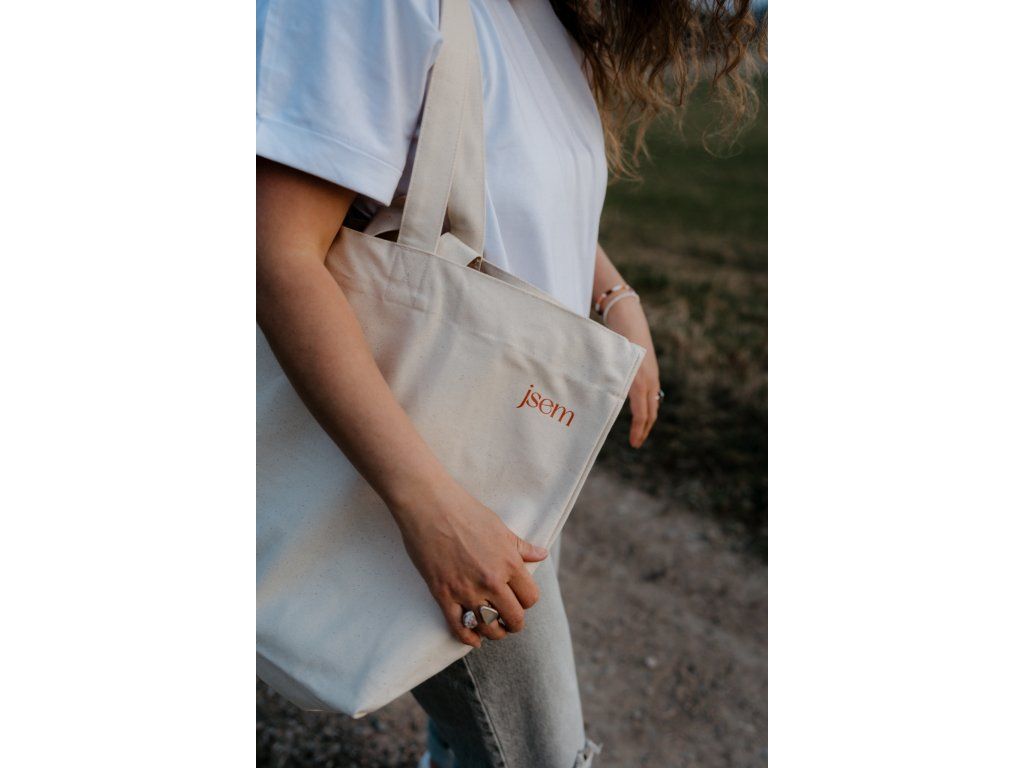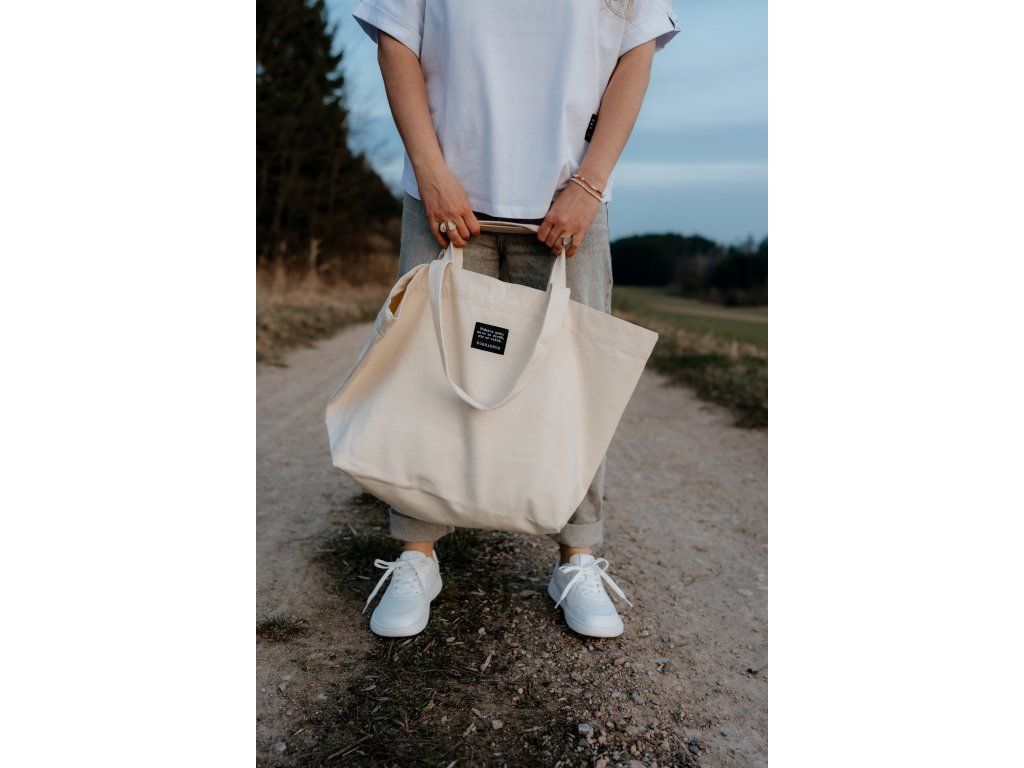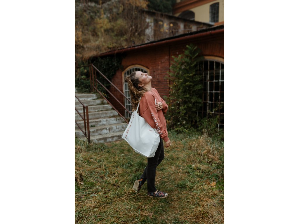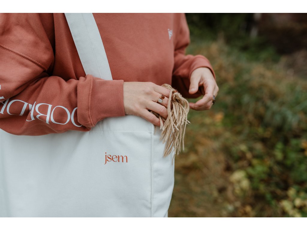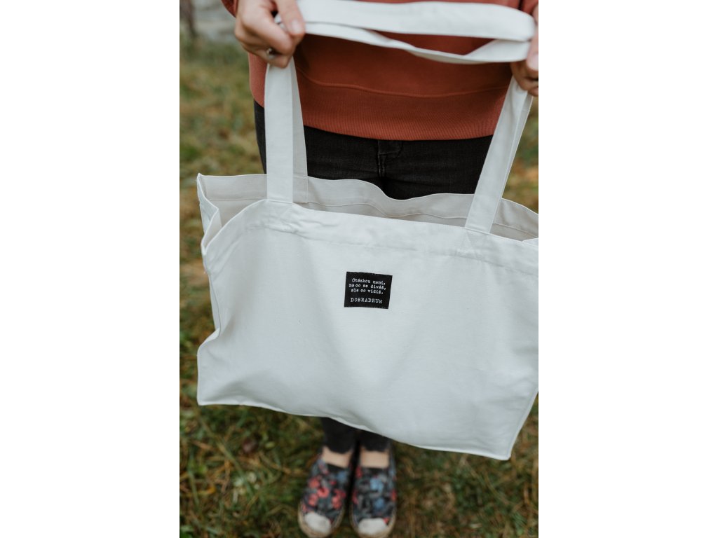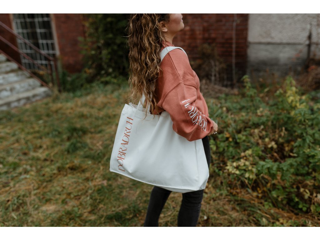 - Taška má na jedné straně tisk jsem dobradruh v cihlové barvě a na druhé našitý štítek s mottem značky.