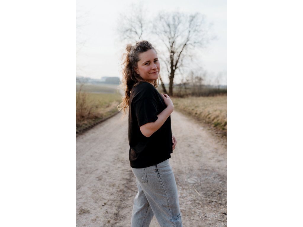- Dobradružka Pája na fotografii měří 162 cm a na sobě má velikost M, kterou běžně nosí. Pro méně oversize look by zvládla i Sko.